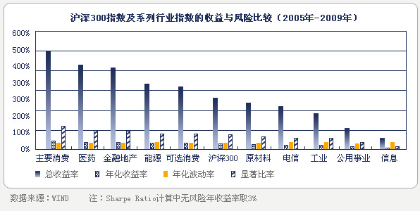 由于沪深300金融地产指数源自沪深300指数,因此,两者表现为较强的相关性,2002年至2009年,沪深300金融地产指数与沪深300指数的相关性达到92%。但在过去五年里(2005-2009),沪深300金融地产指数收益及风险调整后收益(夏普比例 Sharpe Ratio)均好于沪深300指数,同时,沪深300金融地产指数也是沪深300指数中10只行业指数中回报较好的行业之一,在过去五年里(2005-2009)的累计收益率达到419.86%,也远远超过同期沪深300指数的257.57%收益率。 |