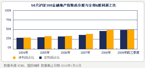 虽然沪深300金融地产指数成分股有56只,但其净利润、总利润在A股中所占的权重且很高,自2004年以来呈现逐年上升的趋势,到2009年前三季度分别达到48.67%和49.25%,56家公司利润几乎占1700多家A股上市公司利润总和的一半。由此可见,沪深300金融地产的基本面实力卓著,是主流价值之选。