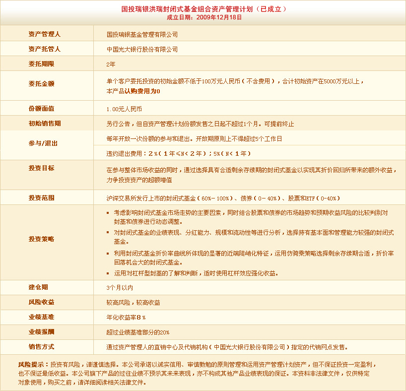 国投瑞银洪瑞封闭式基金组合资产管理计划投资说明书