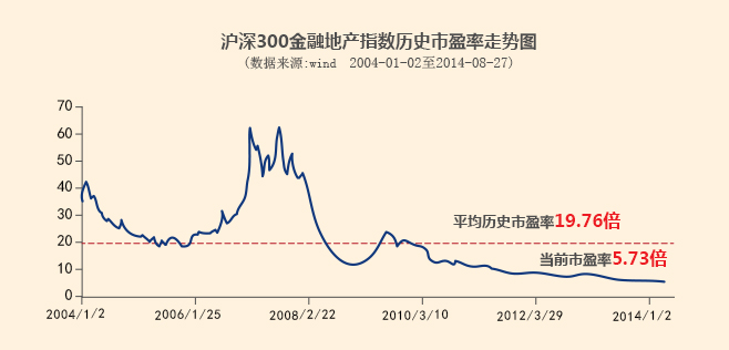| 据WIND统计,沪深300金融地产指数已于3月10日创下5.45倍的历史最低水平,中长期来看,未来向上空间明显大于向下空间。截至2014年8月27日,该指数市盈率在5.73倍附近,依然处于“钻石底”的历史底部区间。在2004年1月至2014年7月期间,该指数的区间最高历史市盈率为62.2倍,区间平均值为19.76倍。 | |||||||||||||||||||||||||||||||||