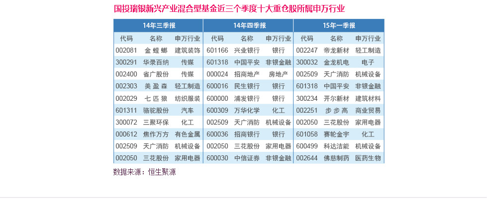 | 纵览近三个季度国投瑞银新兴产业的重仓股,该基金并没有像市场上其他新兴产业主题基金一样重仓“泡沫化”的TMT板块:2014年三季度在重仓传媒的基础上布局汽车、建筑、服装等消费类行业以平衡组合风格;2014年4季度在市场风格发生激烈变化时增加了金融股的配置;2015年1季度重新回归新兴产业,重点关注汽车后市场、环保、O2O等方向。 |