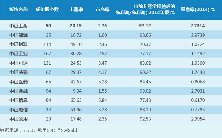 估值低:据wind统计,截至2015年3月26日,目前上游资源指数市净率1.75,市盈率为20.19,资源板块在中证十大行业中处于估值低位(中证能源包含在中证上游中),板块估值有望进一步修复; 收益质量好:扣除非经营损益后净利润占比97.12%,收益质量在中证800一级行业中相对较高; 分红高:从2014年已有的分红数据来看,中证上游的分红率相对较高; |